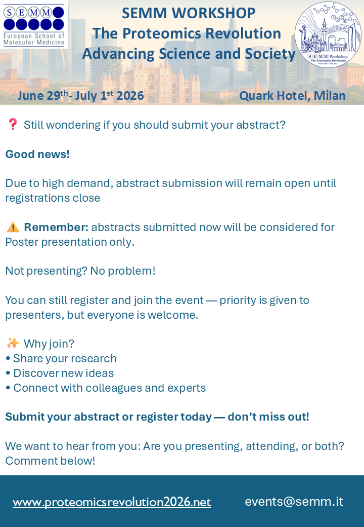 We are pleased to invite you to the SEMM Workshop: “The Proteomics Revolution: Advancing Science and Society” taking place June 29 – July 1, 2026, at the Quark Hotel in Milan, Italy.